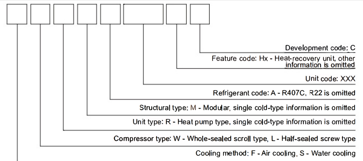 Example: FLRM680C represents air cooled screw type water-cooled (hieat pump)unit, which adopts R22 refrigerant, with the model of 680. It is the fourth generation product.