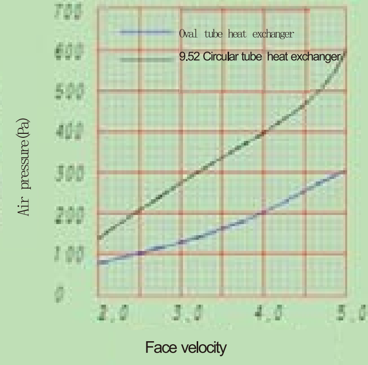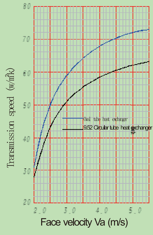 Oval tube avoids the escape of airflow in circular tube, increasing the effective contact surface area by 40%, so as to improve the efficiency of heat exchange. The following figure on the right is the comparison of heat transfer coefficient test results between oval tube heat exchanger and circular tube heat exchanger under different wind velocities. It can be seen from the figure that the heat transfer coefficient of oval tube heat exchanger is about 10%-15 higher than that of circular tube heat exchanger.