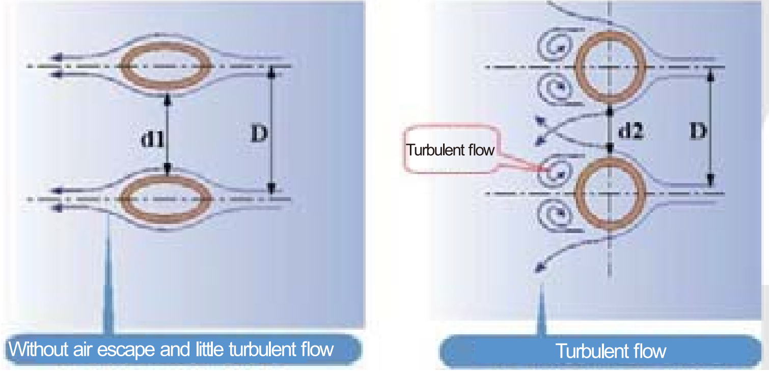 Under same tube spacing,increasing the net flow area between tubes can decrease the net face velocity and reduce the turbulence on the leeward side of oval tube, so as to reduce the wind resistance. The following figures on the left are the comparison of wind-side resistance test results between oval tube heat exchanger and circular tube heat exchanger under different wind velocities. It can be seen from the figure that the wind-side resistance of oval tube heat exchanger is about 50%lower than that of circular tube heat exchanger.