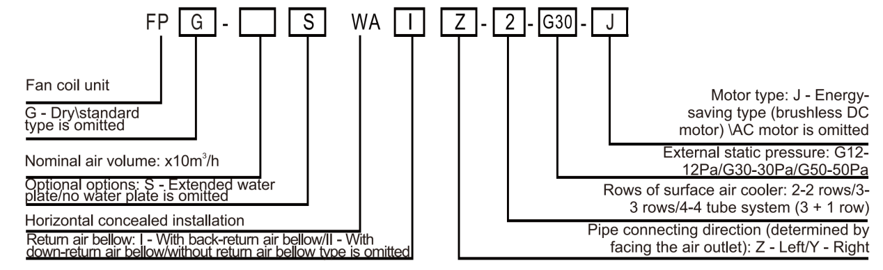 4. Example of unit model denotation: FP-68WAlZ.2-G30 represents: unit air volume of 680m3/h, with back return air bellow, left type pipe connecting, external static pressure of 30Pa, AC motor with 2-row coil, and horizontal type fan coil unit.