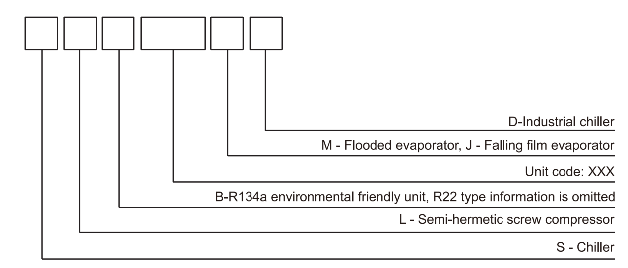 Example: SL610MD indicates industrial water-cooled screw chiller using flooded evaporator, with the model code of 610