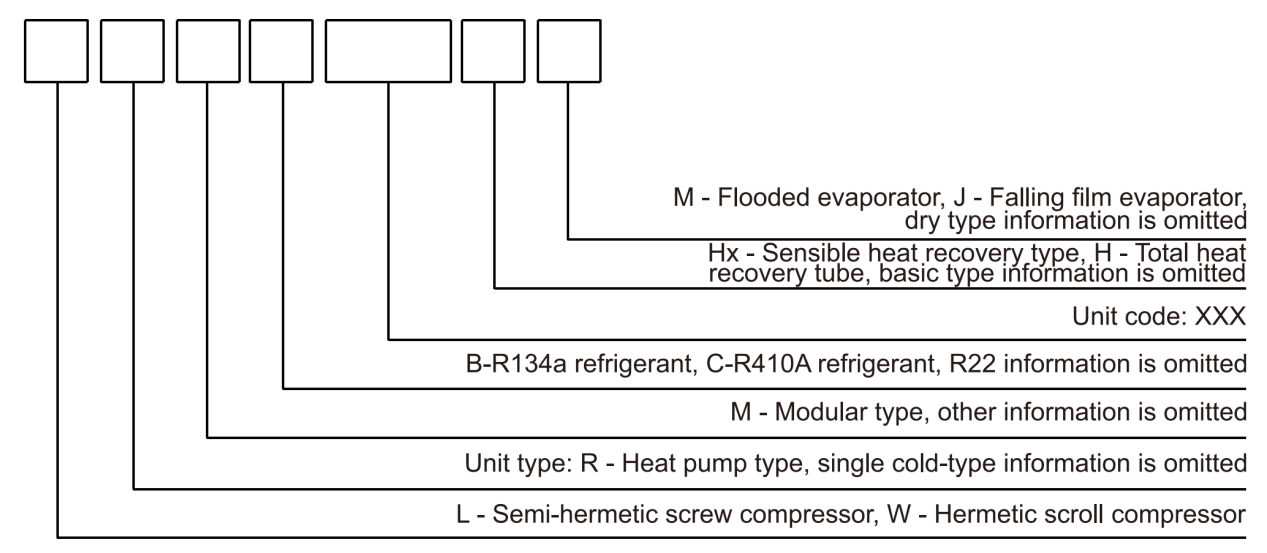 Example: SL920HM indicates total heat-recovery type screw water-cooled chiller using flooded evaporator, with the model code of 920