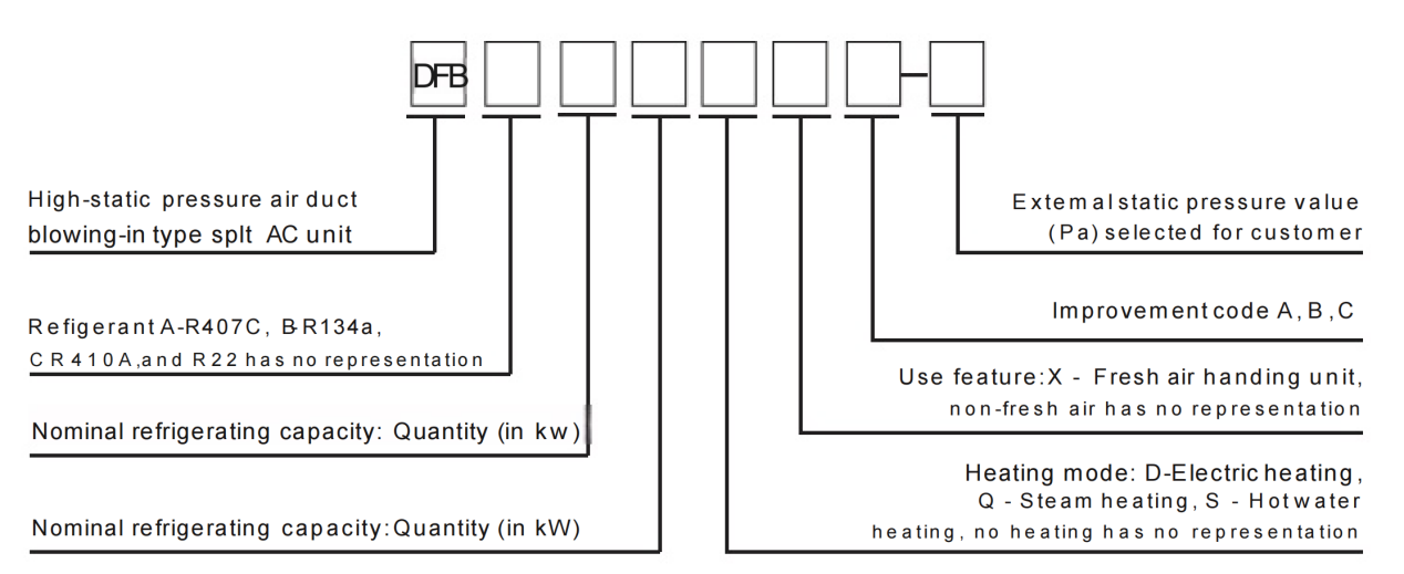 1. DFB28F1Dx-150 indicates a heat pum p a ll fresh air unit with auxiliary electric heating, with the refrigerating capacity o f 28kW, external static pressure of 150Pa and refrigerant of R22.